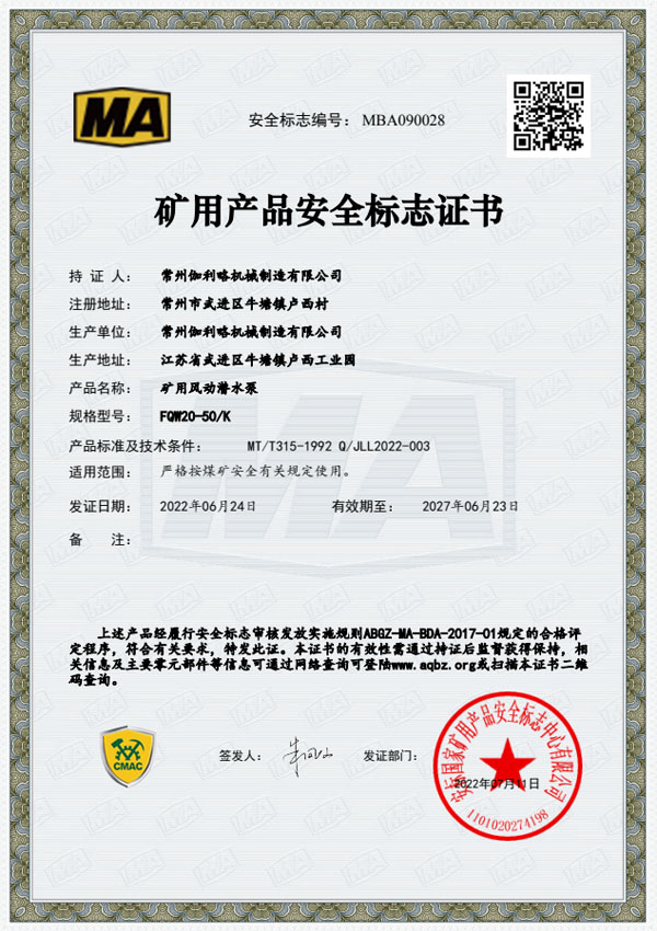 • 礦用安全標志證書-FQW20-50/K